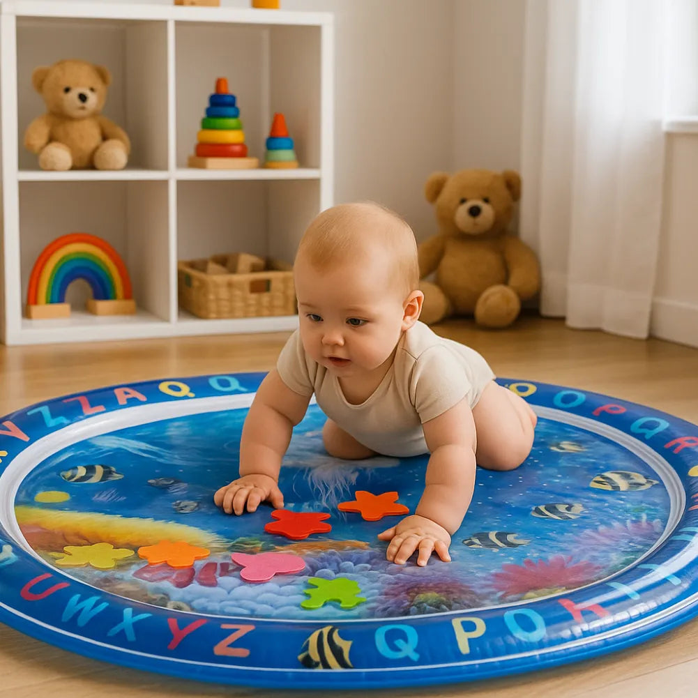 Imaginez votre petit explorateur allongé sur ce cercle d’eau, fasciné par les bulles qui dansent sous ses mains et les lettres colorées qui l’entourent. Chaque geste devient une découverte : toucher, pousser, nommer ! Autour, vous souriez, confiant – car ce tapis d’eau combine apprentissage, sécurité et amusement pour créer des instants de magie parent-bébé.