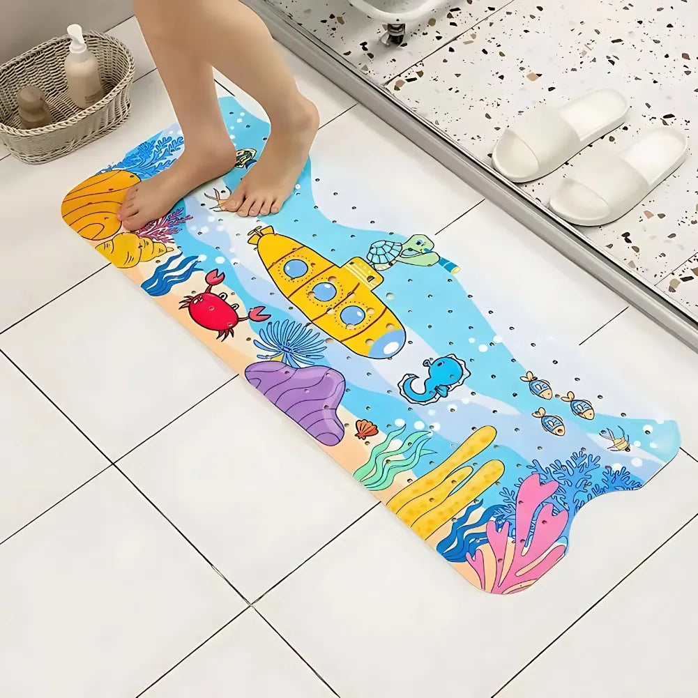 Tapis de bain bébé antidérapant au design dauphin coloré et océan, idéal pour la sécurité et l'éveil visuel.